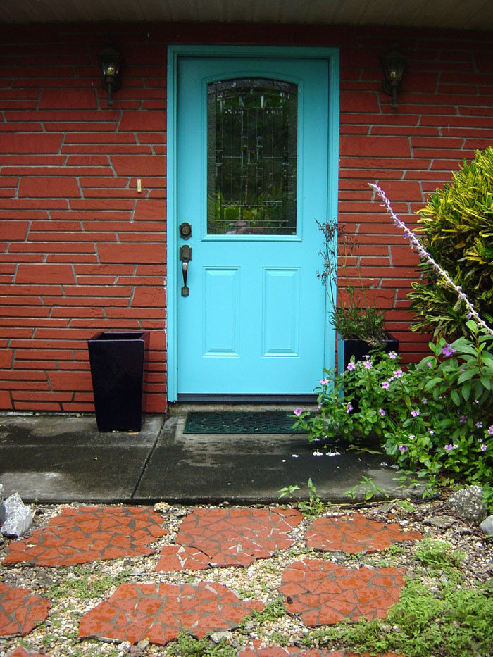 4. This is my front door. The plant in the left pot died and I haven't figured out what to replace it with since the position gets very little rain. I found the croton on the right hidden in the back yard.