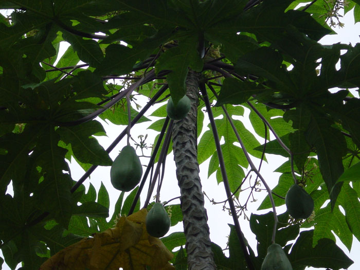 12. This Papaya tree is 2 years old and 20 ft. tall. It's a male Papaya tree with its long dangling fruit. The female tree's fruit is attached at the trunk and they are usually smaller but just as tasty.