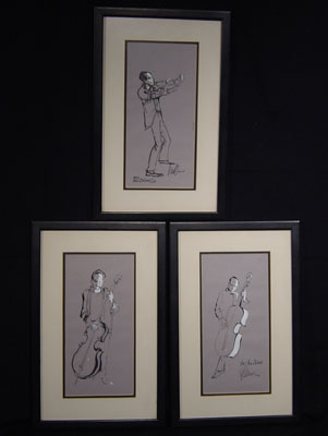 jazz musicians, circa 1960s. Two are signed. Framed sizes: 11" x 17"