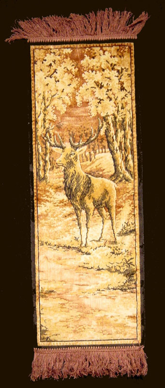 Italian Tapestry Very nice tapestry wall hanging of a deer in the forest with fringe at top and bottom. Colors are coppery brown, tans & black. 36" including fringe) x 11 1/2" Excellent condition.